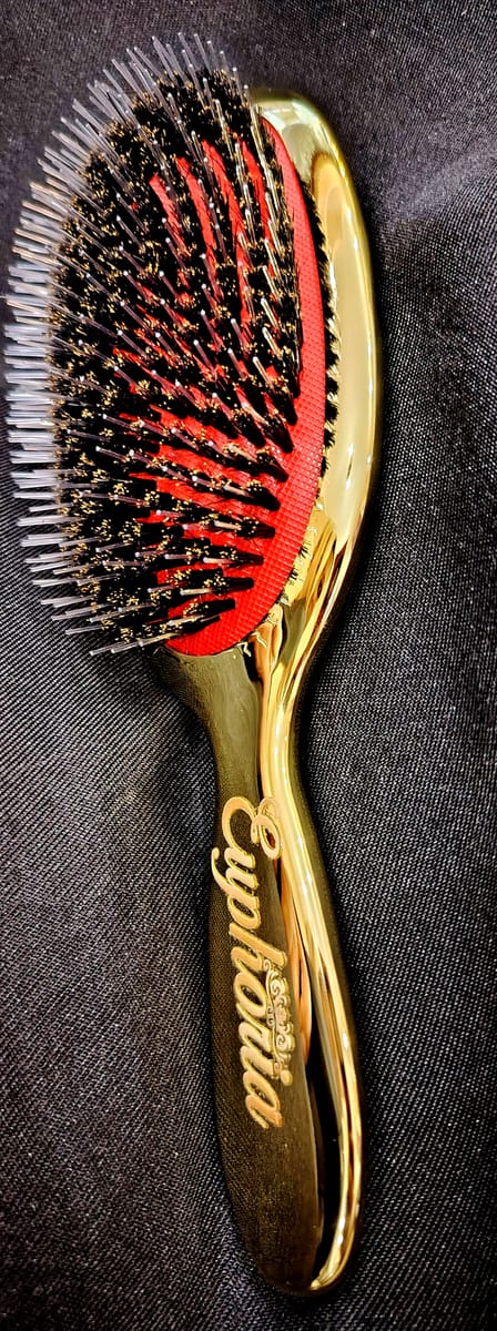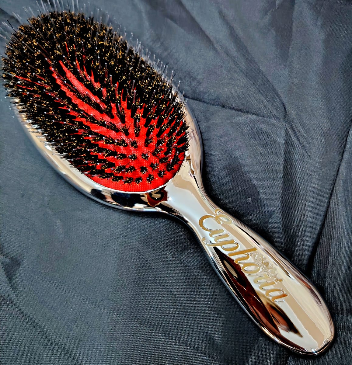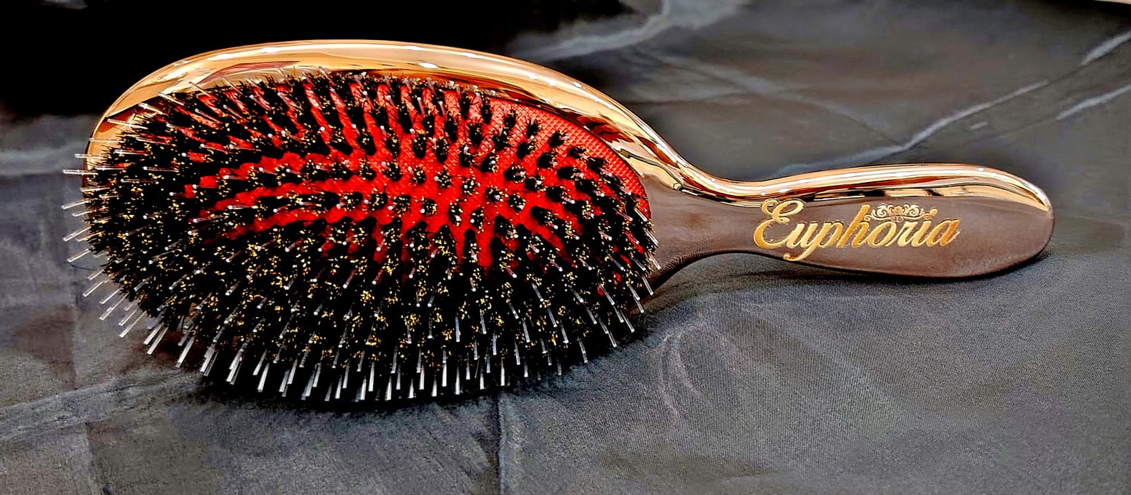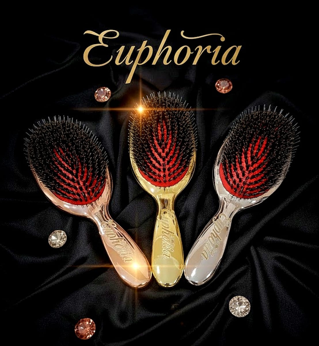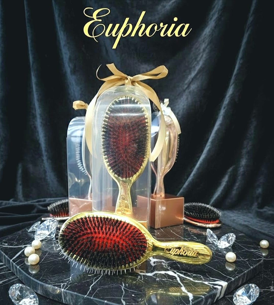 Луксозна четка за коса Euphoria с естествен косъм от глиган в съчетание със силиконови бодлички.С тази четка косата се разресва изключително лесно. Без скубане и накъсване. С нея си подарявате едно прекрасно изживяване, защото притежавате не просто четка за коса, а едно уникално бижу!