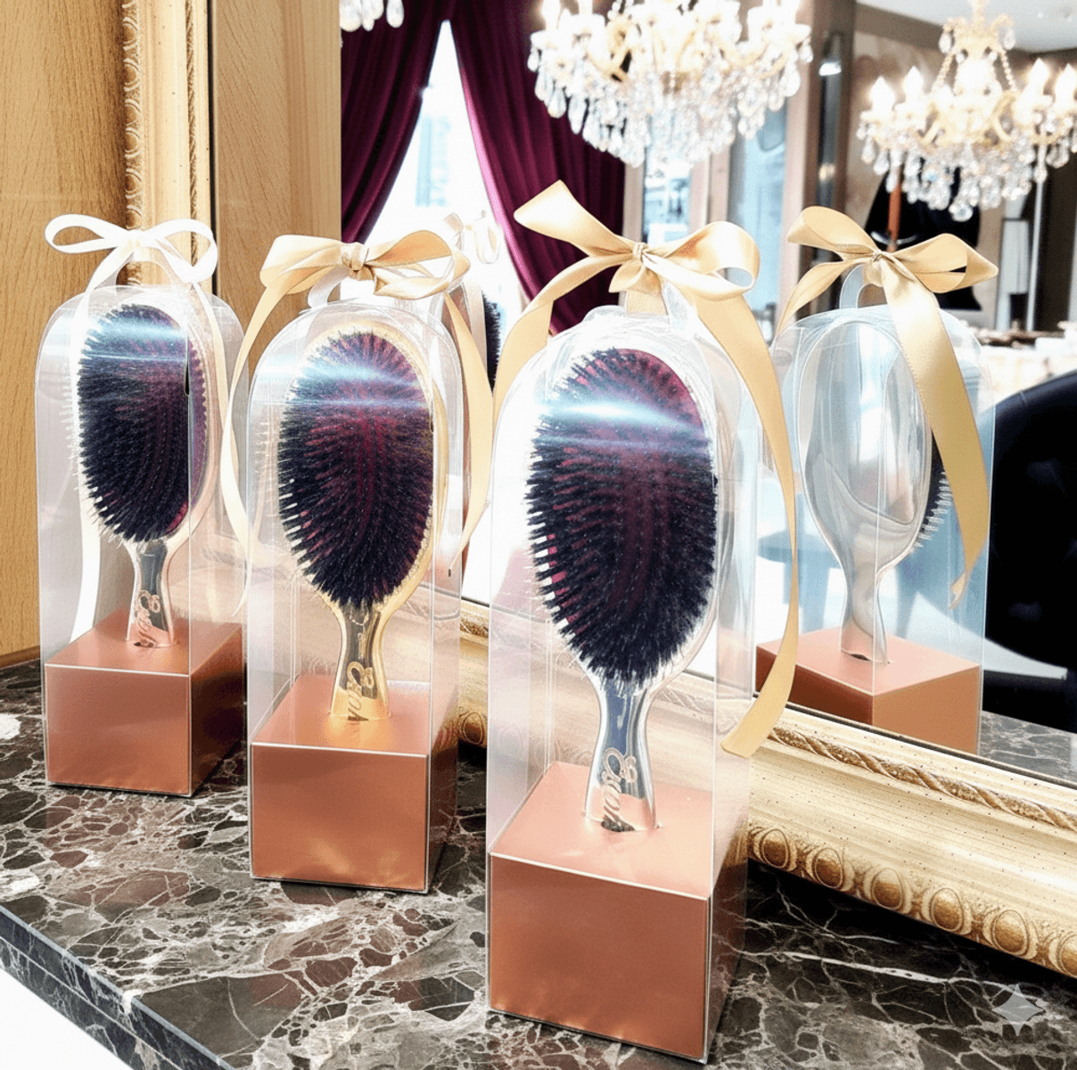 Четката е в луксозна кутия с панделка и е в три цвята : злато;розово злато и сребро.